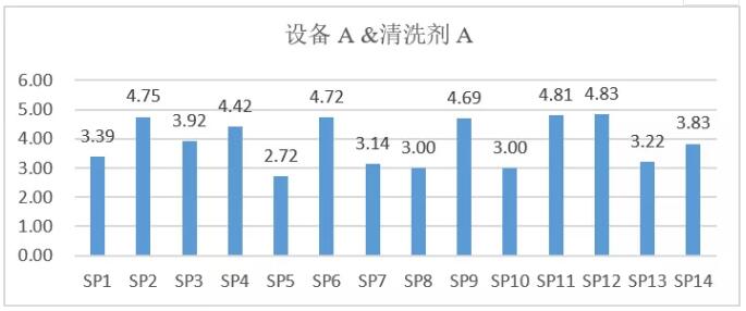 由以上實驗結果條形圖可以直觀地看出,18塊板子在設備A、B、C、D中被清洗的結果完全不同。設備A工作后達到的最大潔凈度是4,設備B中所有板子普遍穩定在4-5之間,設備C中有最多達到水平為5的板子,設備D中結果起伏最大。由此判斷,當使用相同堿性清洗劑時,同一款污染物在四種不同的設備中呈現不同的清洗效果。